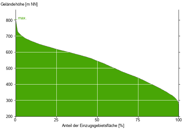 Die hypsographische Kurve zeigt die Höhenlagen und die Gefälleverhältnisse im Einzugsgebiet.