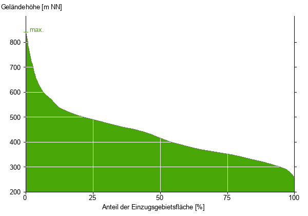 Die hypsographische Kurve zeigt die Höhenlagen und die Gefälleverhältnisse im Einzugsgebiet.